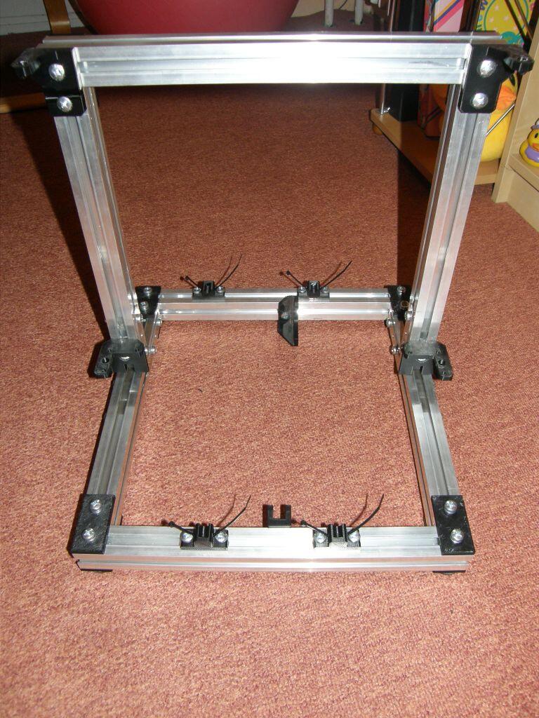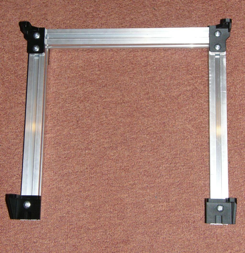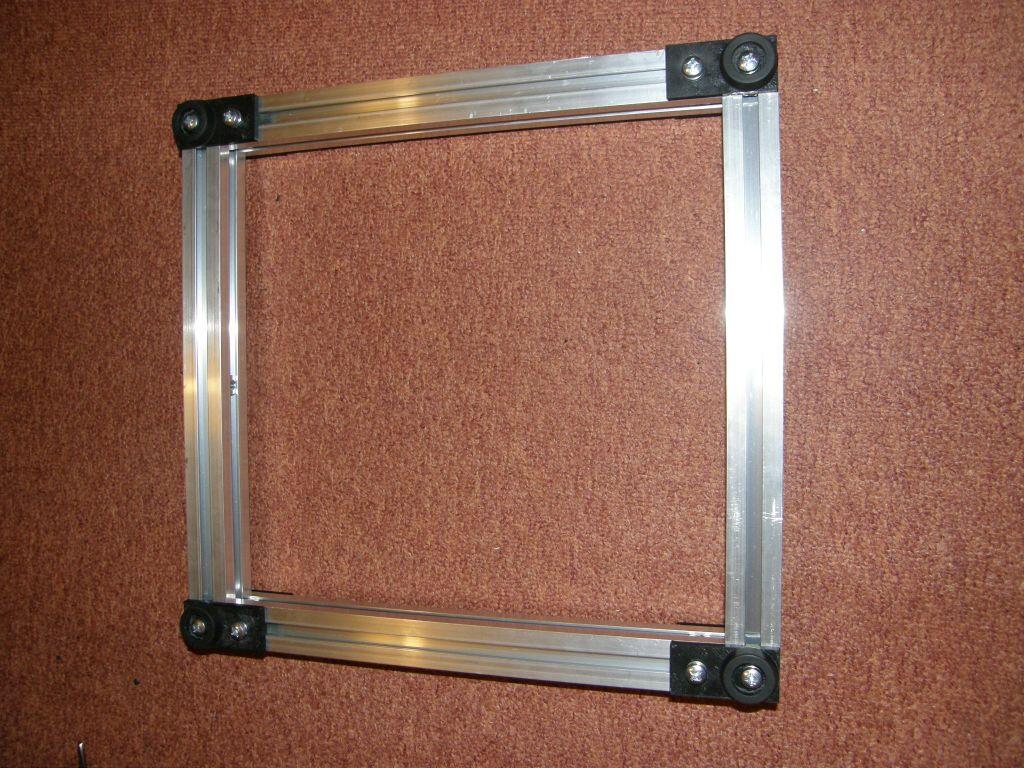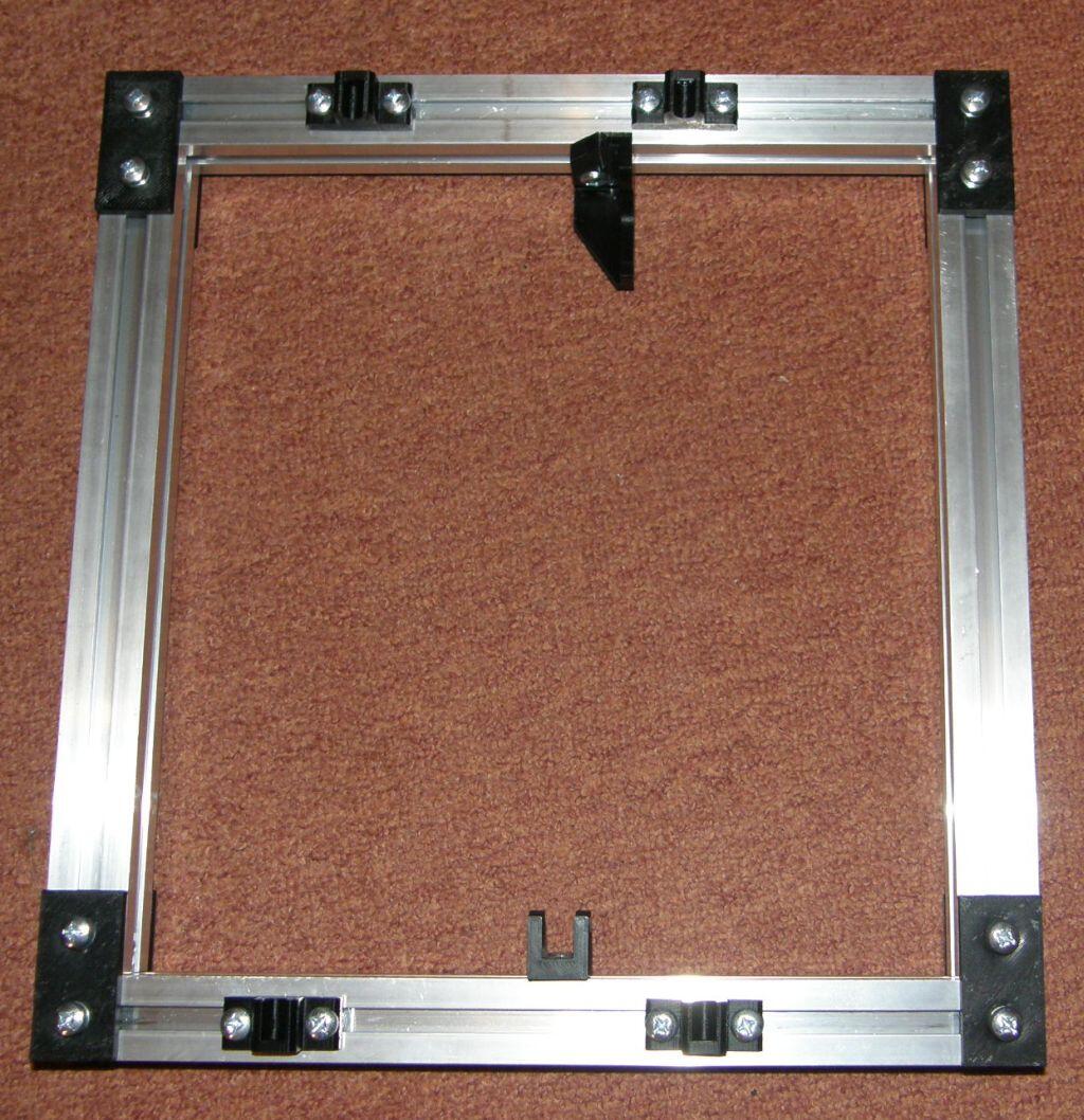 Délka seznamu součástí byla natolik deprimující, že jsem se ani nesnažil sehnat vše dopředu a dělat to nějak za pochodu - ono se nějak lépe nakupuje, když už týden v pokoji zakopávám o kus hliníku, co zatím funguje jako nepraktické těžítko. Plastové součásti jsem vytiskl na dostupné tiskárně. Výkresové soubory jsou dostupné na zmíněném webu. Jediný problém, co se objevil je, že v souborech se nastavuje konstanta s velikostí děr na hlavičky šroubů. Jelikož jsem žádné šrouby v té době neměl, nechal jsem tam default. Ten se samozřejmě později ukázal jako moc malý. Zmíněný hliníkový plátek a desku 220x220x3mm jsem vyprosil ze zbytků. Jen hlinikový plátek neni hlinikový (ale shodl jsem se, že to zdroji vadit nebude) a deska nemá 3mm na tloušťku, ale 1mm, protože 3mm kovu mi přišlo vhodné na stavbu tanku, ale ne tiskárny. Deska vypadá jinak pevně - zatím... Jako první bylo potřeba sehnat hlinikové profily, osvědčil se eshop ehlinik.cz, kde si vyberu kombi stojku, do košíku si naházím rozměry co chci a ještě tentýž týden jsem se těšil z balíčku s profilama. K balíčku jsem měl akorát jednu výtku, kdy profily měly na sobě ještě špony po řezání a během přepravy to některé profily poškrábalo. Jak se ukázalo později, těhlech původních škrábanců si už teď nikdo nevšimne. Kdyby to někoho zajímalo, tak možná nebyl nejlepší nápad na profilech šetřit a koupit si eloxovanou verzi - nejspíš by na nich nebylo už z 20 metrů vidět, že je někdo něžně hladil kladivem. Aby bylo vůbec co kam montovat, bylo potřeba sehnat ještě spojovací materiál - šroubečky, matičky, ... Toho je v seznamu součástek suveréně nejvíc. A moje představa, že to za večer koupím v blízkém hobby marketu, byla značně naivní. Po 2 hodinách štrachání v regálu jsem odešel s 10 pytlíkama (a tedy se skoro pořád neodškrtaným seznamem), šrouby jsem pro jistotu neodnes žádné, protože s plochou hlavou jsem nechtěl a jiné nebyly. Po návštěvě dalšího hobby marketu s podobnou úspěšností mě to přestalo bavit. Na dobrou radu se ukázalo jako lepší místo na nákup Fabory, kde jsem až na pár výjimek přinesl opravdu skoro všechno (pravda, hromada těch věcí nebyla takhle drahá ani v tom hobby marketu, ale nejspíš jsem za ty 2 pokusy už stejně projel víc benzinu). Některé věci mi stále ještě chybí a nebyly dosud potřeba, některé jsem si řekl, že nahradím - třeba že místo těch 14mm dlouhých šroubů koupím víc těch 16mm, protože 2mm je houby rozdíl. Mno... k tomu se ještě vrátíme :-) Tak, máme plastové díly, většinu spojovacího materiálu a hliníkové profily - čas zkusit něco postavit - třeba alespoň rám.