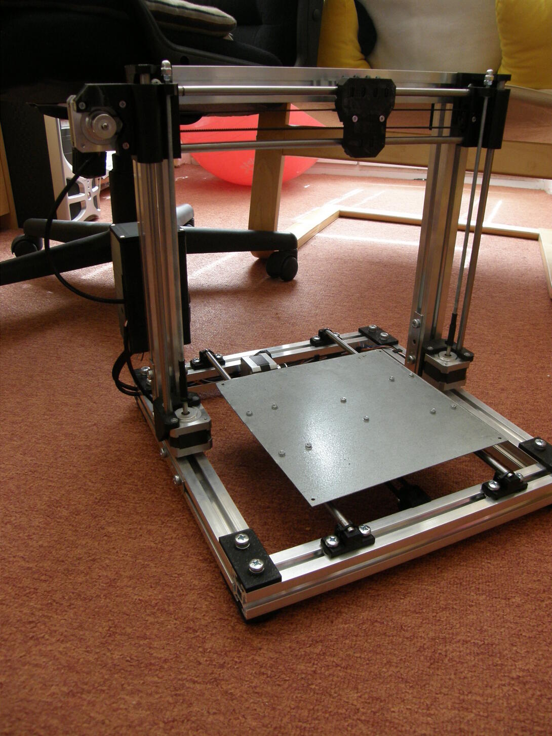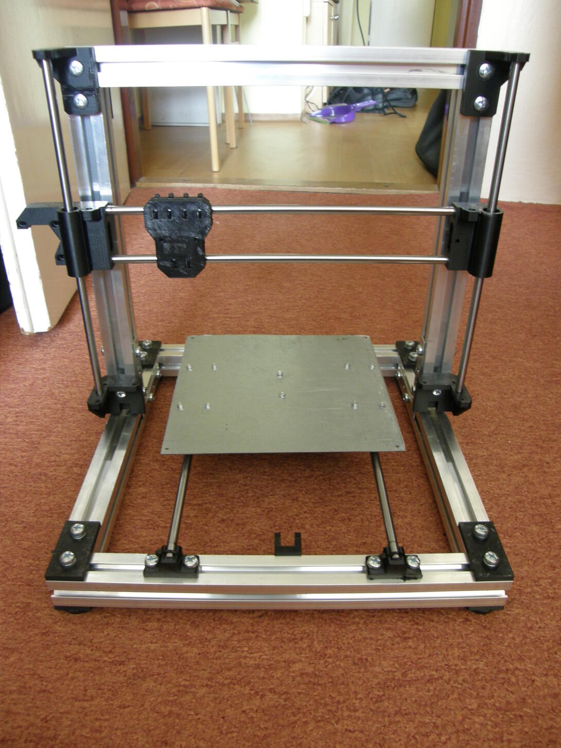 Tím by byla postavena ta část tiskárny, která se má hýbat - prakticky tedy ta větší mechanická část - následuje už v zásadě hraní si s elektronikou (kterou po prozkoumávání objednávám z Číny, neboť to stojí třetinu a stejně to co koupím u nás nejspíše přišlo z Číny úplně stejně) a nastává fáze dlouhého vyčkávání, než se sejde dostatek věcí na to, aby s tím šlo něco dále dělat. Pokud někomu přišlo, že jsem tentokrát rozbil málo věcí, tak jsem si to na závěr vynahradil. Krokové motorky mají napevno přidělané kabely (4 kabely na každý motorek), z výroby tak hezky namotané na sebe. Kabely jsou vcelku docela dost dlouhé. Rozmotal jsem je teda do plné délky před montáží - u motorků na Z osu se to i udělat muselo, protože se před montáží motorku musí kabel protáhnout rámem tiskárny. Ovšem jsem z toho rozjaření, že se Y vozík hýbe, nějak nedomyslel, že není moc dobrý nápad s ním jezdit sem, tam, sem, tam, ... v době, kdy se všude válejí kabely od motoru. Samozřejmě jsem od jednoho Z motoru (pochopitelně od toho nejvíce vzdáleného, kde potřebuji plnou délku těch kabelů) kabel vozíkem přejel - dráty jsem narval do ložiska LM8UU a pěkně jim tak oškubal izolaci... Takže jsem opět na závěr skóre srovnal :-) Jelikož elektrikářská izolačka mi navíc došla (a kabel až na izolaci jinak vypadal vcelku), tak jsem se jal do opravování dalšími smrštitelnými bužírkami. Ještě že se ten kabel schovává do rámu :-)