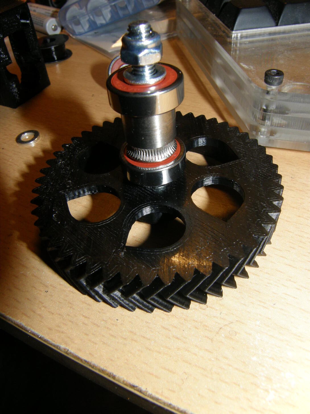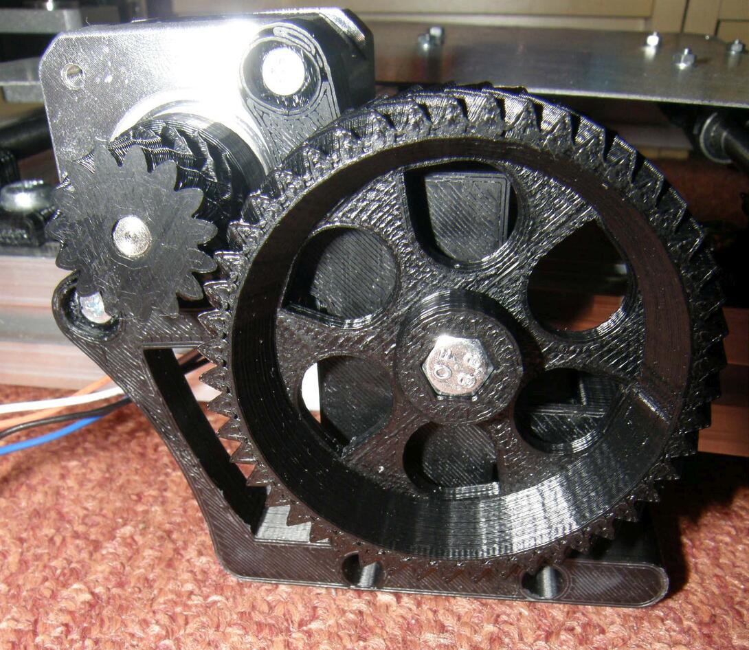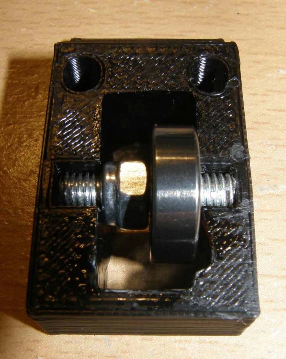 První hnací kolečko vypadalo z fotek (viz foto níže) hodně podobně tomu, které bylo v originální tiskárně. Po doručení a vybalení bylo ale na první pohled zřejmé, že má o dost větší průměr. To by samo o sobě ještě tolik nevadilo, jako daleko horší se ukázala poloha vroubkové části vůči červíku, kterým se kolečko upevňuje na šroubu. Kolečko se totiž na šroub musí umístit tak, aby zoubkovaná část byla přesně na úrovni děr, kterými se prostrkává filament. A zároveň se musí na šroubu vejít do prostoru mezi dvě ložiska - ložiska jsou na šroubu umístěná na konkrétní pozici, protože přesně zapadají do vybrání v plastovém bloku. A tady přesně nastává ten problém - kolečko umístit zoubkama přesně na úroveň děr nejde, protože je moc vysoké a ložisko tam začně v tu chvíli překážet. Prostě ikdyž se kolečko nacpe co nejvíc na libovolné ložisko, jsou pořád zoubky o pár milimetrů posunuté proti dírám. A tady se zrodil naprosto nesmyslný a nefunkční, idiotský nápad, patrně z hladu a nedostatku IQ. Když ten filament strkám do díry zeshora a on se objeví pár milimetrů od zoubků upevněného kolečka, co takhle vyvrtat ještě jednu díru o pár milimetrů vedle? Že je to úplná kravina? Je, ale to mi došlo až o pár hodin a dvě zničené součástky později :-) Inu, vyvrtal jsem díru, prostrčil filament s radostí jak zapadá do zoubků, beru do ruky extruder idler a radost záhy přechází, když vidím, že přítlačné ložisko tlačí někam úplně jinam než na strunu. Bohužel ani v tomhle kroku mi nedošlo, že je to kravina a tak beru do ruky pilník a piluju extruder idler, aby ložisko šlo posunout vedle. To se po hodině pilování (a zanesení úplně všeho prachem z drceného ABS) povede, ložisko zafixuju pojistnou M5 matkou, přikládám celý díl k extruderu a dívám se, jak ložisko hezky přitlačuje strunu. Posouvám tedy strunu dále a... jejda. Neříkal jsem předtím, že ty díry byly dvě? Tady se už konečně začíná v kebuli rozednívat a dochází mi, že to fakt byla blbost. Jednu díru jsem sice hezky převrtal, ale ta druhá - výstupní - je pořád na stejně blbém místě, jako byla tamta. Tuhle díru už také prakticky převrtat nejde - z druhé strany díry je v plastu kruhový výřez, do kterého přesně zapadne j-head. Díru tedy nemá smysl převrtávat, protože j-head má jasně danou pozici kde skončí a předěláním díry stejně nedocílím toho, aby se filament dostal až do j-headu. Odkládám tedy stavbu extruderu stranou s tím, že bude doopravdy potřeba jiné kolečko. Extruder idler je nenávratně zlikvidován a je potřeba jej vytisknout znovu. Druhá díra na bloku funkci nijak zvlášť nevadí a tak tam je doteďka, aby mi stále připomínala, že se na to vrtání mám vykašlat, když nevím co dělám.