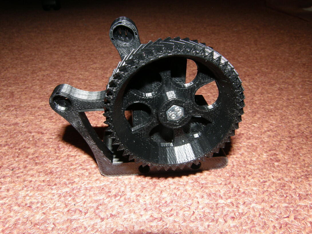 Nyní tedy ještě k tomu jak to funguje - hnací kolečko je malé zubaté kolečko, které je chycené na šroubu, který se točí s velkým plastovým kolečkem. V plastovém boku nad a pod místem, kde mají být zuby kolečka, je malá díra (která je tam už vytištěna). Díra nahoře je normálně viditelná, hmatatelná, díra dole ústí do místa, kde je pak přimontována trysky. Funguje to tedy tak, že se nažhaví tryska, veme se struna s materiálem a strká se do díry nahoře. Zároveň při zastrkávání se rukou točí velkým kolečkem. Až strune doleze k hnacímu kolečku, skřípne se mezi hnací kolečko a ložisko naproti. Následně tedy točení velkým kolem by mělo mít za následek, že zoubky hnacího kolečka se zadrhnou o strunu a budou ji posouvat dále (rukou můžeme ověřovat, že točení kolečkem posouvá strunu dolu). Až struna projede nažhavenou tryskou, začne z trysky vycházet roztavený plast. V tu chvíli je struna zavedena a může se tisknout - tiskárna bude točit motorem, který přes převod bude točit velkým plastovým kolem a to bude tedy strunu tlačit do trysky.