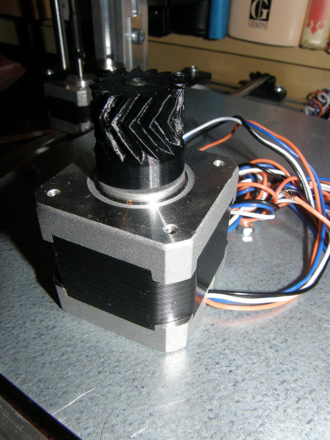 | Alespoň nacpat to ozubené kolečko na motor nebylo nijak složité | Takhle vypadá skoro hotový, až na těch pár drobností okolo (kupodivu ten zbytek jde doopravdy rychle). Jenom mu chybí ta jedna plastová součástka, která se musí znovu vyrobit :-) |