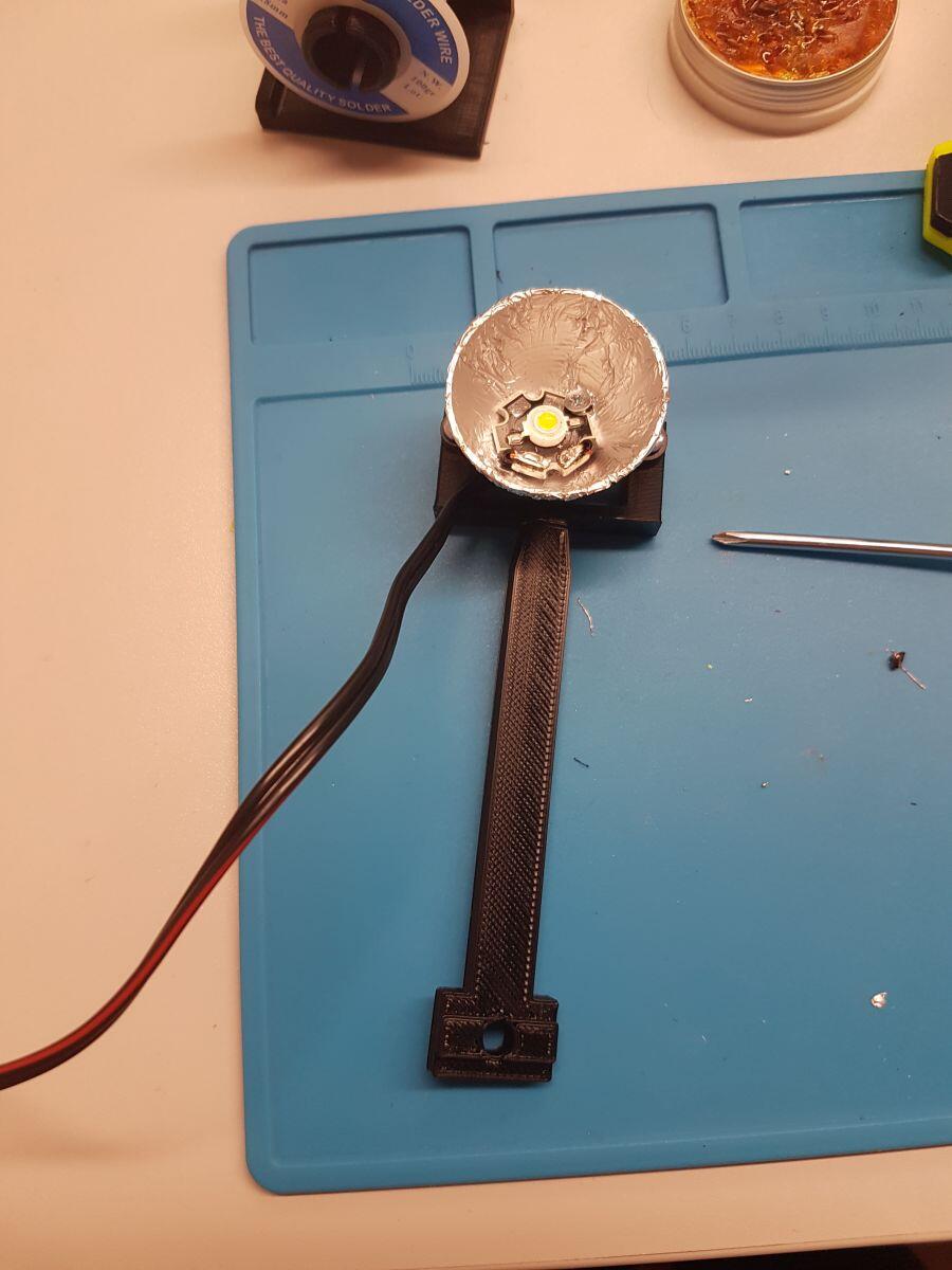 Nicméně, spínání zdroje na osvětlení alespoň nějak fungovalo. Zbývalo tedy umístit LEDky na tiskárnu. Na thingiversu jsem našel model paraboly pro LED osvětlení, do které se vešel celý tišťák i s LEDkou. Takže jsem jej vytiskl, vylepil zevnitř alobalem, aby odrážel zbytky světla, co se vrátí a přišrouboval dovnitř LEDky. Pak už jsem k tomu dokreslil jen držák velice podobný tomu, co se dává na Raspberry kamery, přidělal na něj parabolu a celek jsem přišrouboval k rámu tiskárny (tedy matka do profilu a k té to zašroubovat). Svítí to parádně, i v úplné tmě kamera nyní krásně vidí.